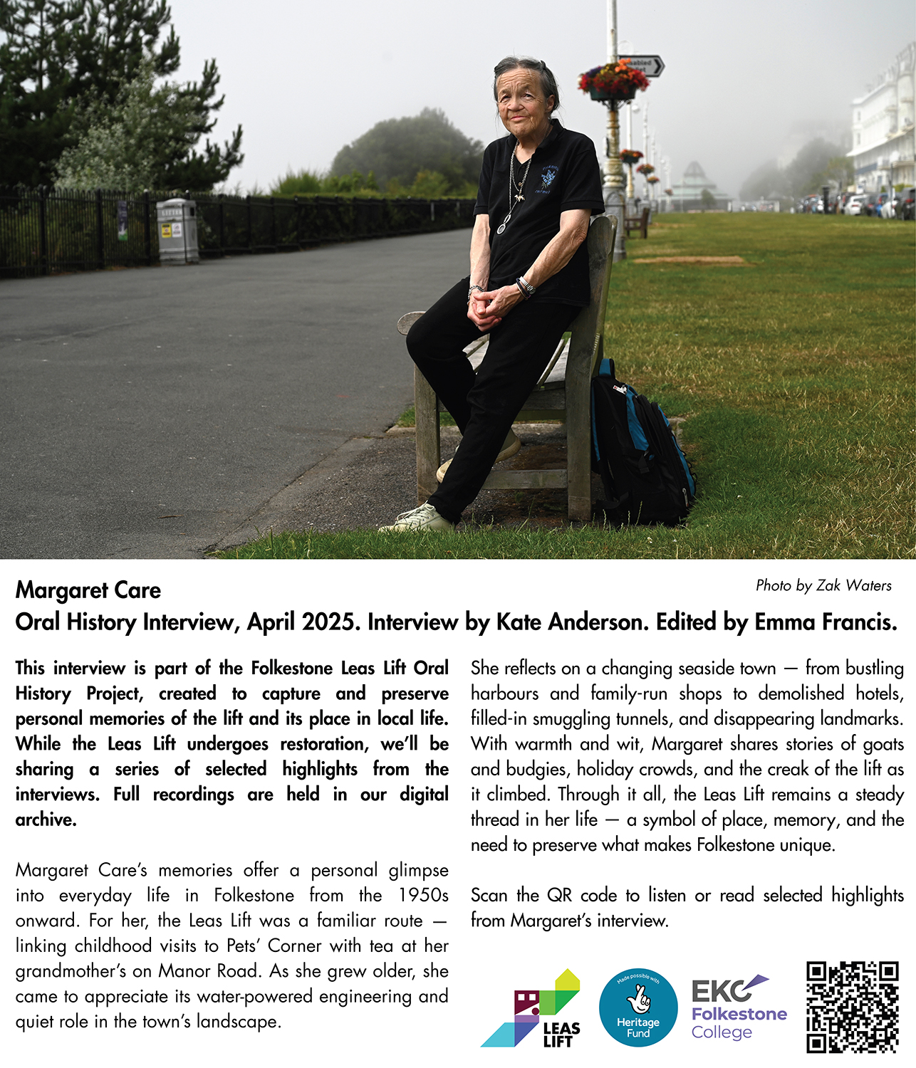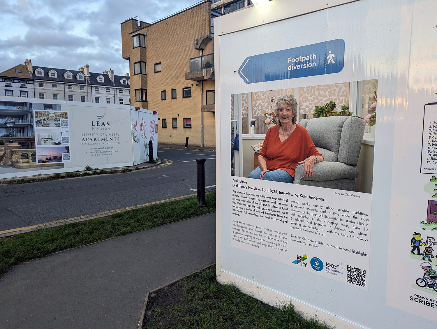 The installations on the Upper Station hoarding features a QR code linking to one of these stories. Participants reflect on childhood outings, seaside traditions, changing landscapes, and the role the Leas Lift played as both a practical mode of transport and a special part of the Folkestone experience.